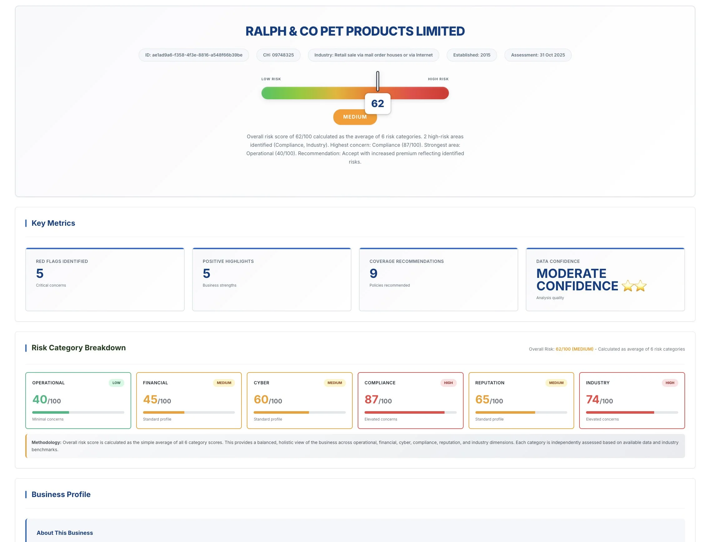 Enter a Companies House number and a website URL—Joro does the rest.Our engine orchestrates government, web, cyber, reviews, and news sources to assemble a complete SME risk picture in minutes.