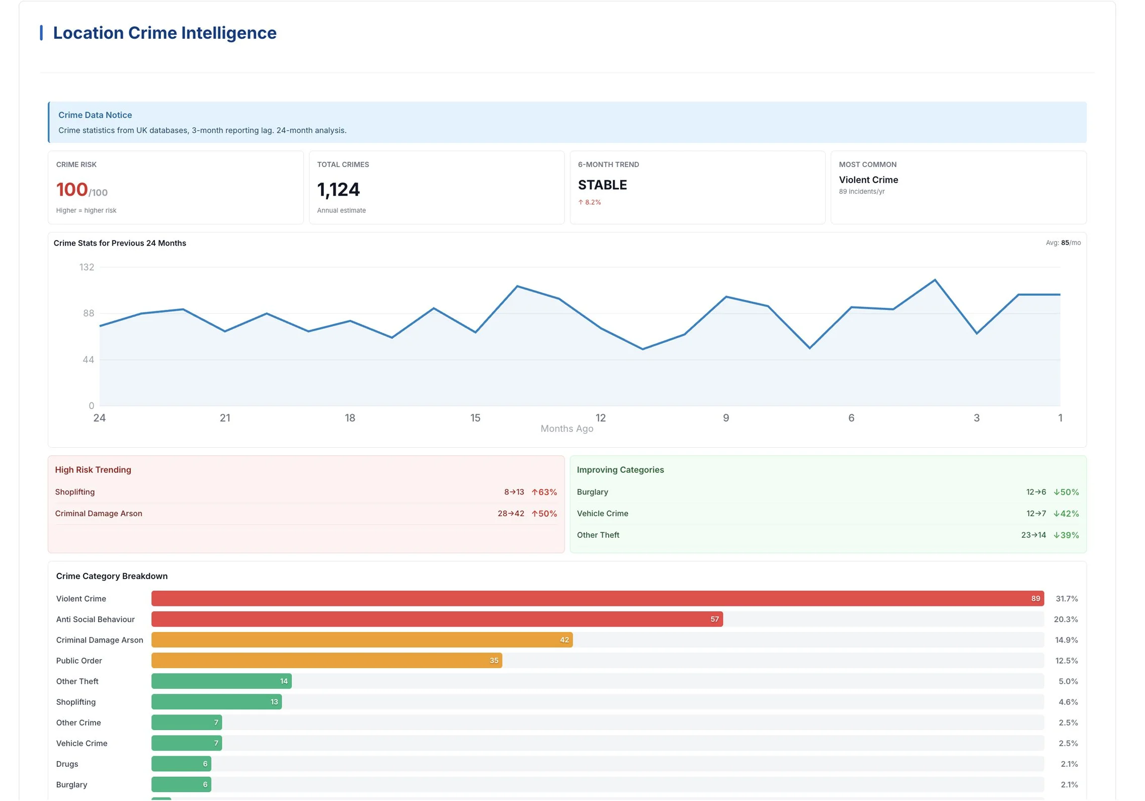 Live profiling of SME crime risk. Alert customers or insurers of sudden changes in local crime statistics that can affect risk and claims.